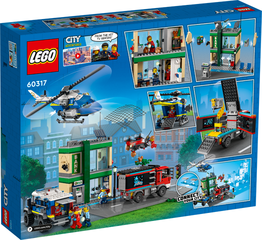Endless action awaits with this LEGO City Police Chase at the Bank (60317) playset, featuring a function-packed bank building, a cleaner’s truck that folds out into a crooks’ heist vehicle, a police helicopter, police truck and 6 minifigures, including 5 popular characters from the popular LEGO City Adventures TV series, plus a Road Plate system for connection to other LEGO playsets.