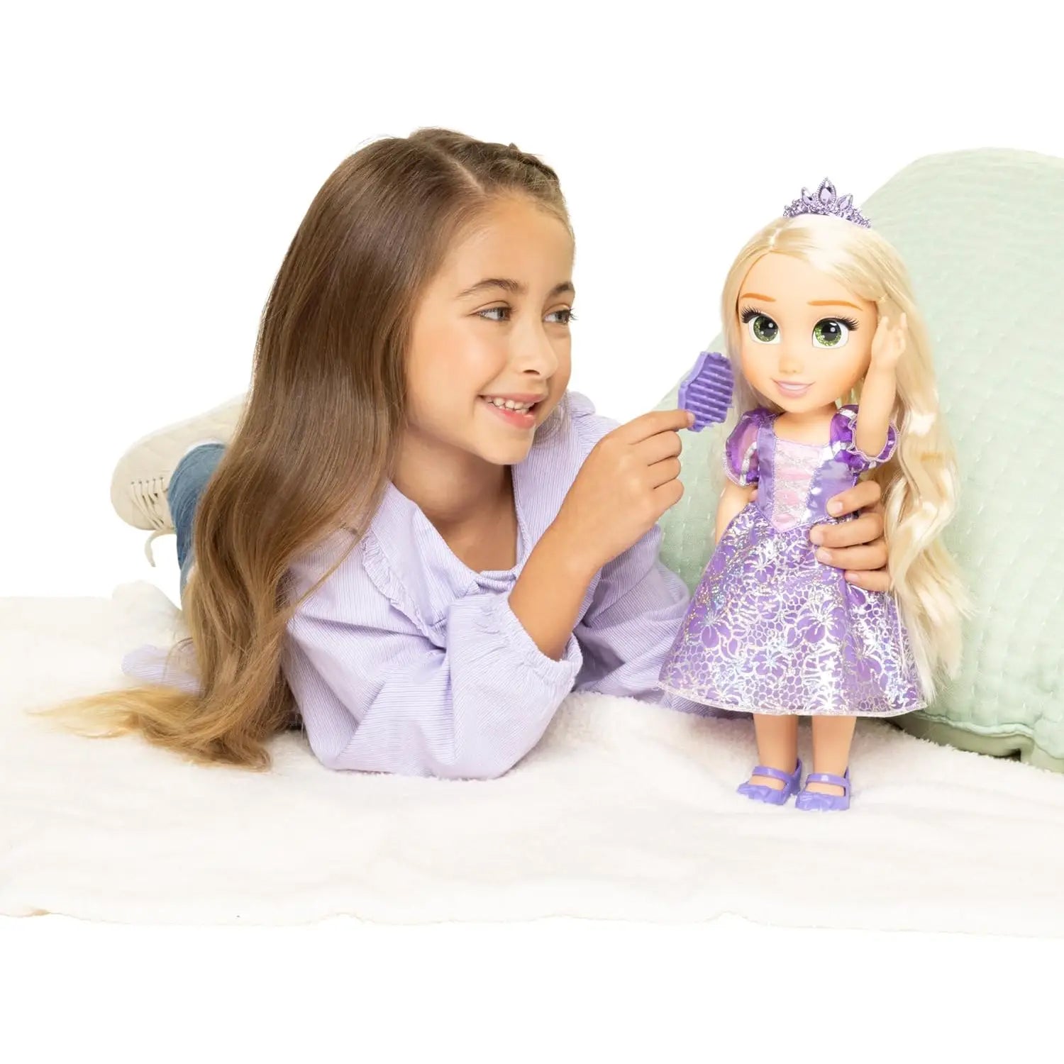 Have the best day ever with Playdate Rapunzel! Inspired by Disney's Tangled, Playdate Rapunzel is ready to be your best friend forever. Rapunzel is 32" tall and fully articulated at the neck, shoulders, elbows, wrists, hips and knees, making her perfectly poseable for any adventure! Use the brush to style Rapunzel's long golden locks. She's also dressed in her movie inspired purple dress and comes with shoes and a tiara.