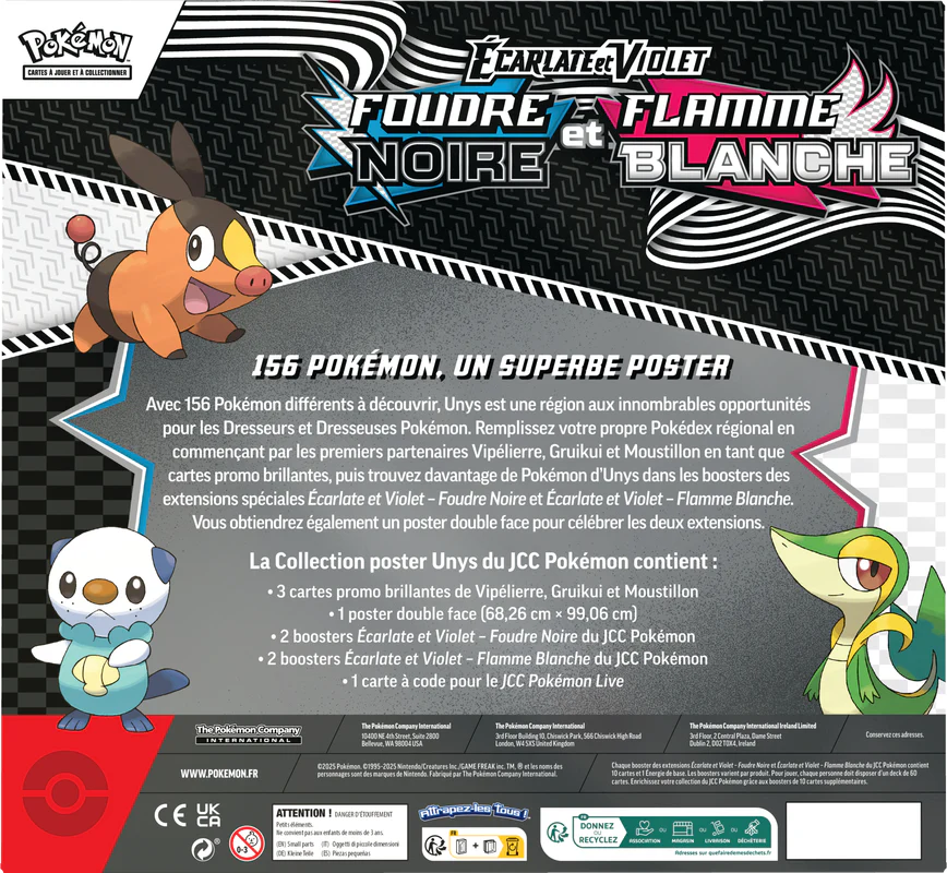 With 156 different Pokémon to discover, Unova is a region full of opportunities for Pokémon Trainers! Fill up your own regional Pokédex starting with the first partners Snivy, Tepig and Oshawott in the form of promotional cards, then find other Unova Pokémon in the booster packs of the special Scarlet & Violet-Black Bolt and Scarlet & Violet-White Flare expansions. You'll also receive a double-sided poster celebrating the two expansions.