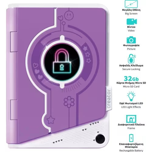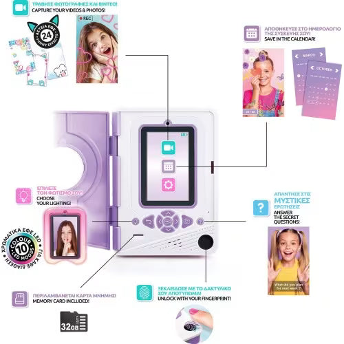 Record and protect your private thoughts with the ultimate secret video journal!Unlock it with your fingerprint for next-level privacy, then record journal entries on the big 4' screen with 10 LED mood lights to set the vibe