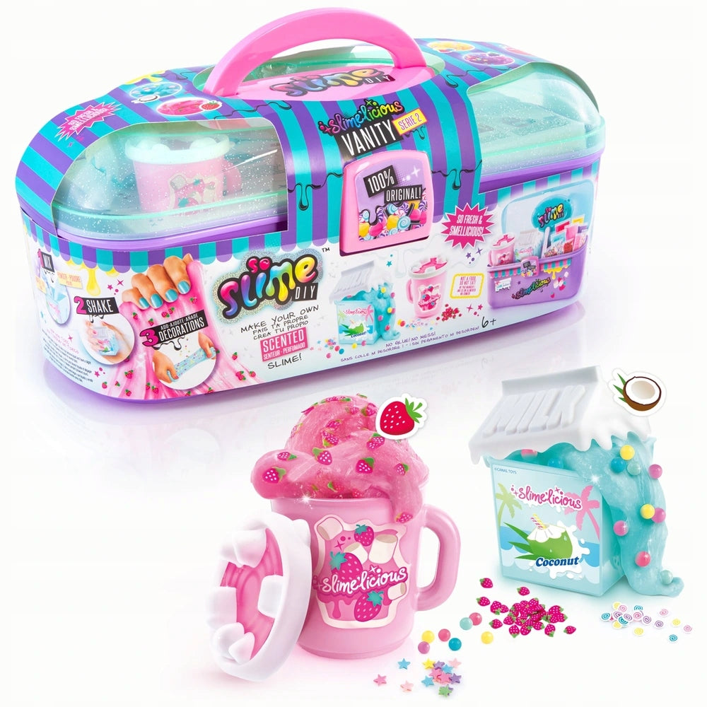 Slime promotes fine motor skills and promotes individual playtime. This kit comprises of tool case, 2 shakers in the shape of a milk carton and a hot chocolate cup, 5 different slime powders (hot cocoa, bubble gum, grape, strawberry, and popcorn), several decorations, spatula, stickers and labels